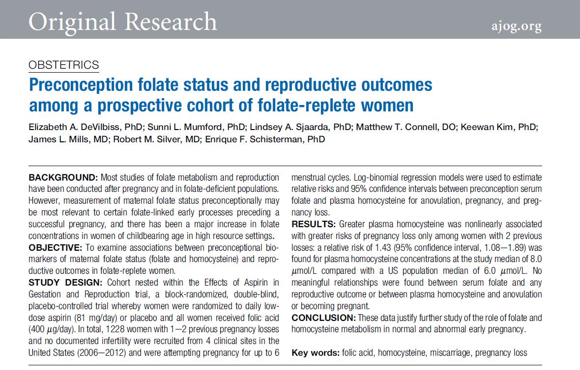 تابع الباحثون مستقبليًا 1228 امرأة لهن تاريخ مرضي واحد أو أكثر حالتي إجهاض سابقتين، وكانتا تتناولان باستمرار 400 ميكروغرام من الفوليك حمض يوميا. وكشفت النتائج: