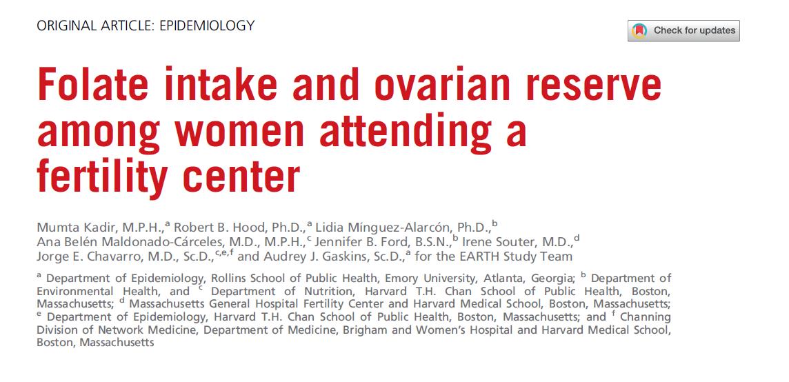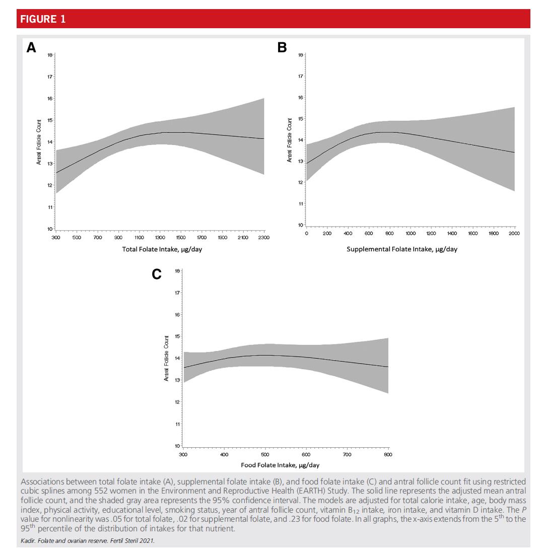 حللت هذه الدراسة بيانات من 552 امرأة زارن المركز مركز الخصوبة بمستشفى ماساتشوستس العام في الولايات المتحدة، مع التركيز على العلاقة بين تناول حمض الفوليك ووظيفة احتياطي المبيض (يتم قياسه بواسطة عدد الجريبات الغارية، AFC).