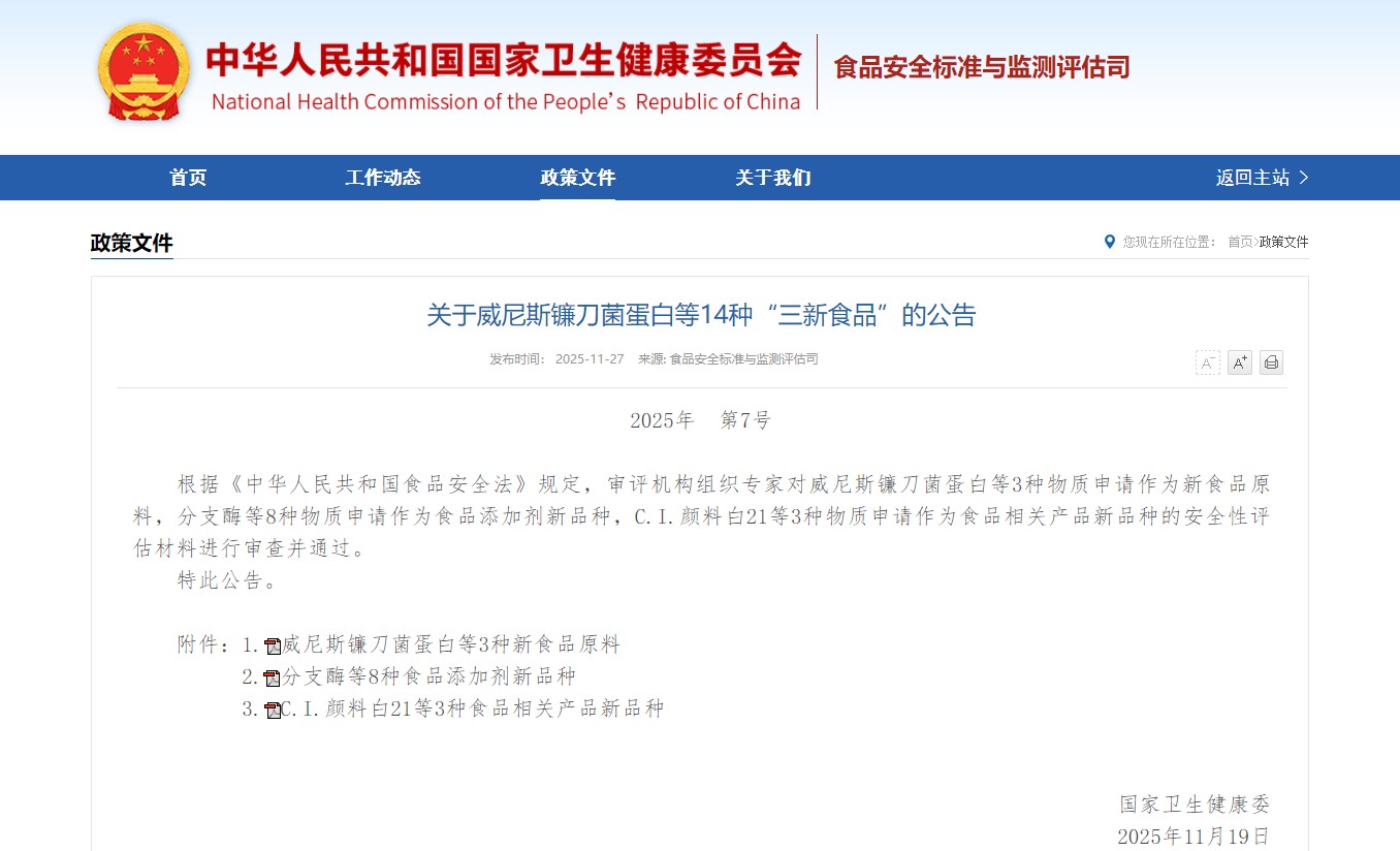 [1] لجنة الصحة الوطنية لجمهورية الصين الشعبية.إعلان على 14 "ثلاثة أطعمة جديدة" بما في ذلك بروتين فيوزاريوم البندقية (2025، رقم 7).