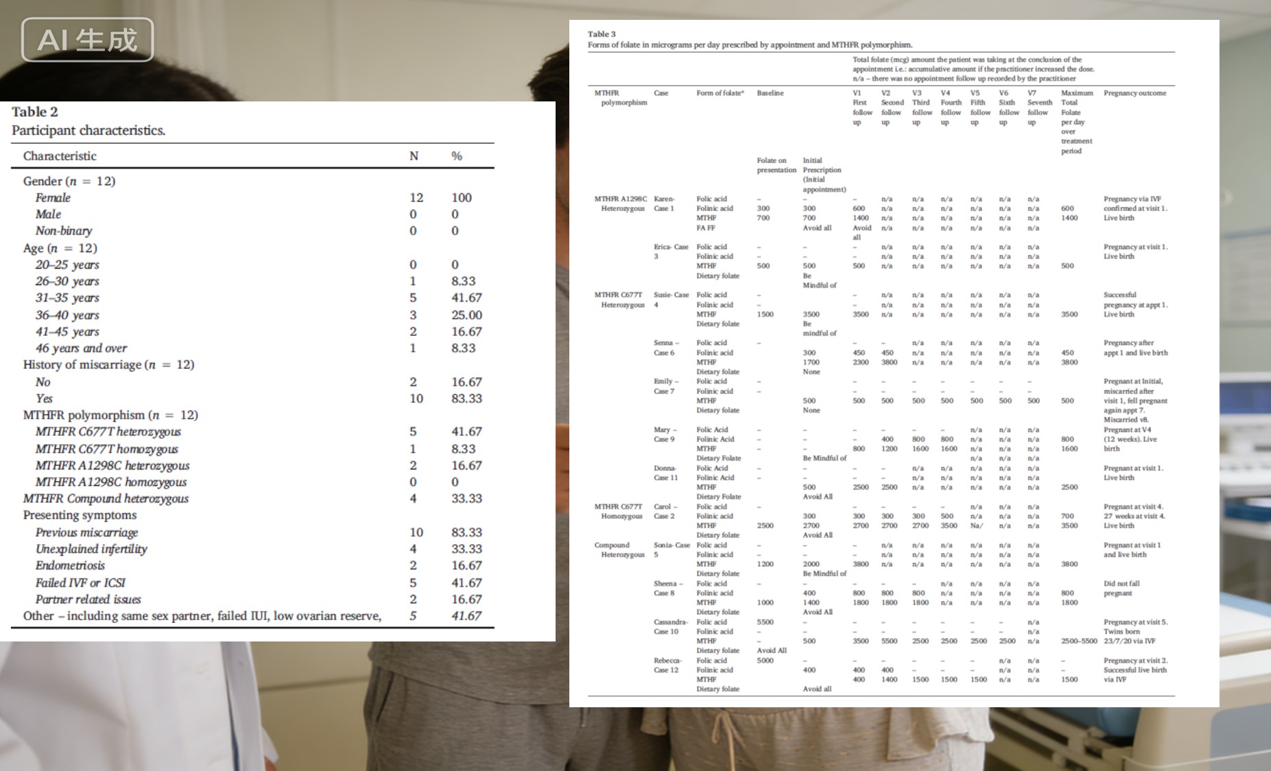 شملت الدراسة 12 مريضة، 83.3% منهن لديهن تاريخ من الإجهاض و41.7% تعرضن لفشل دورات الإنجاب المساعدة. كانوا جميعا تم تشخيصه بتعدد أشكال الجين MTHFR (الأكثر شيوعاً هو C677T متغاير الزيجوت، مركب متغاير الزيجوت، وما إلى ذلك). بالنسبة لهؤلاء النساء، كل اختبار حمل سلبي كان أكثر من مجرد رقم، فهو يمثل الإرهاق العاطفي والجسدي. أصبح العثور على خطة غذائية مناسبة حقًا أمرًا ملحًا.